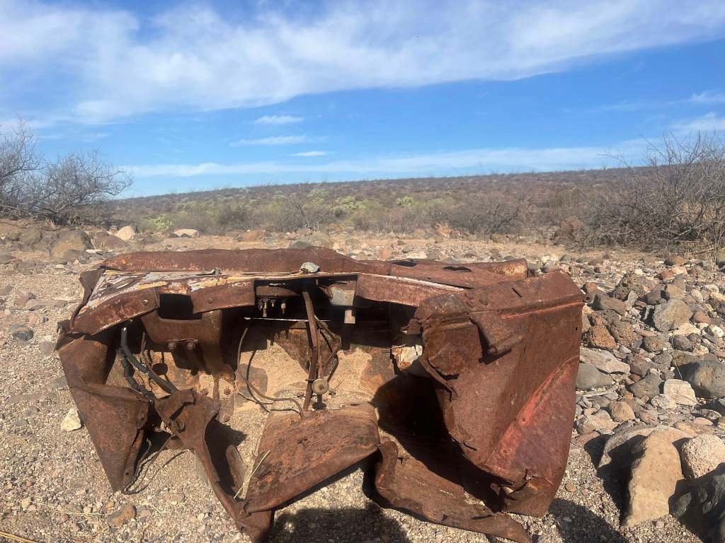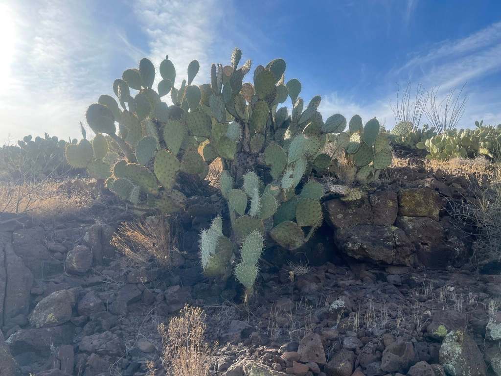 While at Black Hills Rockhound Area, I wanted to walk down to the wash (dried river bed) to hike. Although I didn’t expect to find geodes, I enjoy exploring dry washes as they feel like transitioning between ecosystems. However, getting into the wash was tricky due to fields of prickly pear. The solution is to follow the steer poop trail, which leads directly to a spot where you can descend into the wash gracefully.